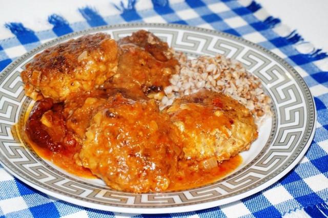 Далее отдельно обжариваем на сковороде порезанный кубиками лук и в конце вливаем соус. Прогреваем его и выкладываем гречаники в сковороду. На слабом огне доводим блюдо до готовности. Двадцать минут – и гречаники в томатном соусе готовы.