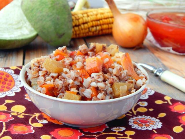 На сковороду наливаем растительное масло, разогреваем его. Кладем на сковороду репчатый лук и морковь, обжариваем их до мягкости. К овощной зажарке отправляем приготовленный фарш. Сразу перемешиваем его с овощами, чтобы он не обжарился в одном комке, разошелся небольшими частичками. Жарим фарш на среднем огне около 10 минут, периодически помешивая. Затем в сковороду кладем кабачок, болгарский перец, помидоры. Добавляем соль и черный молотый перец по вкусу, перемешиваем. Тушим на медленном огне около 20 минут, чтобы овощи стали мягкими и пустили сок. Кладем на сковороду с овощами и фаршем гречку, равномерно распределяя ее по поверхности. Заливаем содержимое сковороды водой, чтобы она была выше на два пальца. Накрываем сковороду крышкой и тушим около 20 минут, до готовности гречки. Крышку снимаем, перемешиваем, огонь выключаем, сковороду снова накрываем крышкой и оставляем на плите на 20-30 минут. Подаем блюдо к столу.