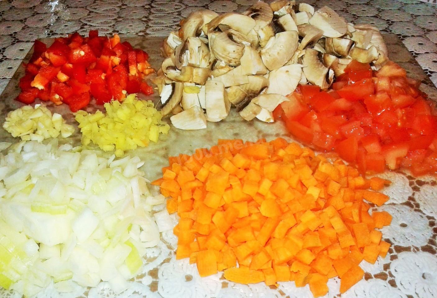 Добавляй по очереди овощи - морковь, болгарский перец, чеснок, имбирь.