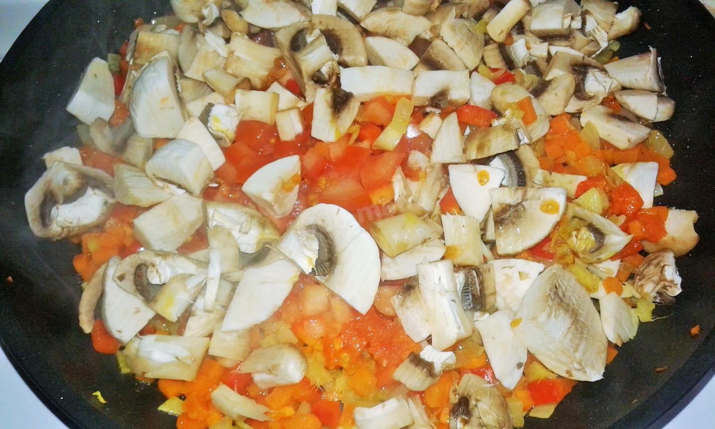 Добавь помидоры и грибы, оставь тушиться на пять минут.