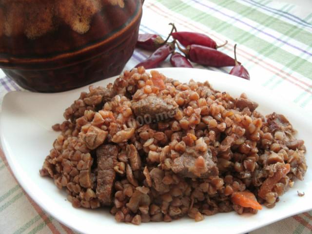 Следующий этап приготовления заключается в том, что нужно распределить все овощи с мясом и промытую гречку на два горшочка. На дно каждого горшочка выкладываем слоями: 2ст.л-овощей с мясом, затем 2ст.л- гречки и т.д., пока все не закончиться, сверху должен получиться слой овощей с мясом.