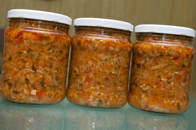 Раскладываем готовый горячий салат по заранее подготовленным стерилизованным банкам, закатываем стерильными крышками. Переворачиваем банки вверх дном, укутываем пледом и оставляем в таком виде медленно остывать в течение суток. После салат убираем на постоянное место хранения. Хранить такой салат можно как в холоде, так и при комнатной температуре.