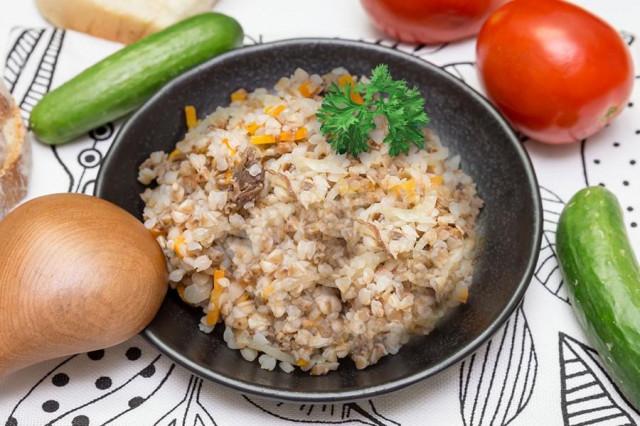 3. Обжариваем ингредиенты в течение 5 минут при постоянном помешивании, затем добавляем тушенку и предварительно промытую гречку, насыпаем соль и черный молотый перец, перемешиваем, заливаем водой (1 л примерно) и варим до полной готовности.