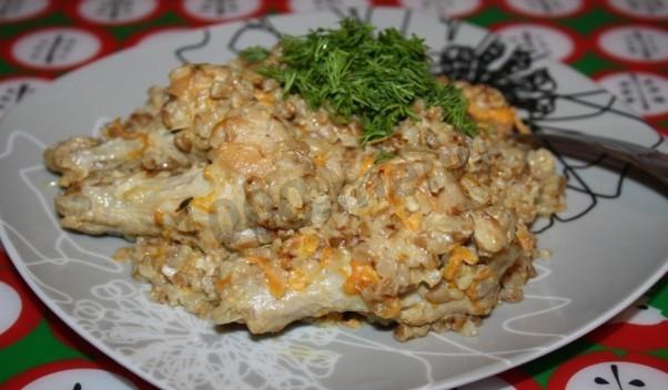Затем высыпать поверх курицы 2 стакана гречки (если берете гречку в упаковке, то ее нужно перебрать от мусора и промыть, а если берете в порционных пакетиках, то в этом нет необходимости).