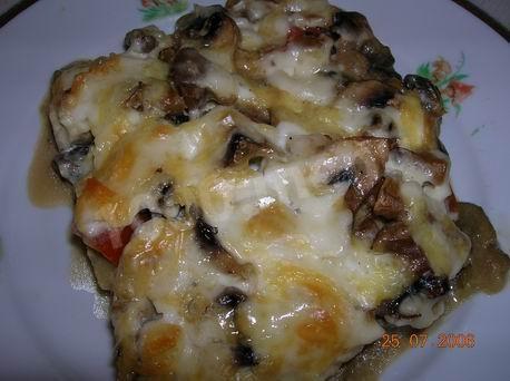 Шампиньоны режим тонкими пластинками,смотря как вам нравиться,нагреваем сковороду и вылаживаем туда грибы,через минут 10 добавляем туда лук нарезанный кубиками,солим,перчим,ещё минут через 10,добавляем фарш подсоленный,мешаем и слегка обжариваем,потом добавляем кубиками резанные помидоры,после того как смесь потушиться хорошенько.добавляем сыр,готовим ещё минут 5 и выключаем.