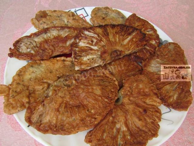 Собрать в лесу свежие грибы зонтики. Обрезать ножку, шляпки помыть и обсушить. Приготовить кляр: в глубокую посуду вбить 2 яйца, добавить соль, перец, крошку сухого зонтика, все хорошо перемешать и ввести постепенно муку непрерывно помешивая. В готовый кляр окунуть шляпки «Зонтиков» и обжарить в растительном масле с каждой стороны до золотистого цвета. Вкуснейшие грибы «Зонтики» в кляре готовы! Приятного аппетита!