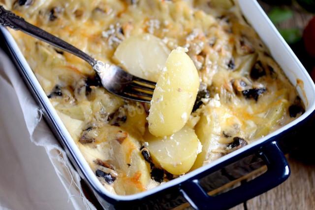 6. Поставить форму для запекания в духовку на 25-30 минут. За это время картофель окончательно приготовится и пропитается ароматами жаренных грибов и сметанно-сырным соусом.