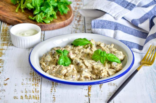 Хорошо перемешайте и оставьте на огне еще на пару минут. Можно добавить немного горячей воды, чтобы соус получился не сильно густым. Готовые грибы подавайте к столу. На гарнир отлично подойдут картофельное пюре, гречка или макароны. Приятного аппетита!