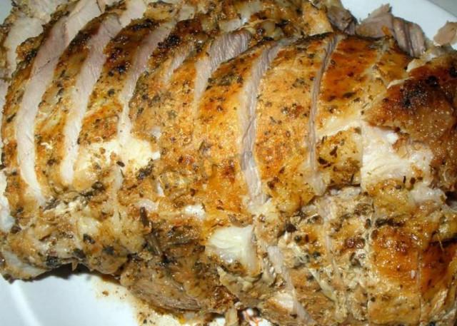 Грудинку переложить на лист фольги и на противне поставить в духовку, заранее разогретую до 200С. Мясо будет запекаться около 1 часа. Подавать свиную грудинку можно и в горячем, и в холодном виде. Приятного аппетита!