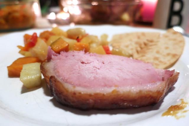 Ставим мясо запекаться в духовку на 30-40 минут при температуре 180 градусов. Если имеется режим гриля, то тогда понадобится меньше время для создания хрустящей аппетитной корочки. Свинину вынуть из духовки и нарезать тонкими ломтиками. Я обычно подаю с запеченными овощами, такими как репа, картофель, морковь и болгарский перец. Эта копченая свинина имеет нежный и сочный вкус. Простой способ приготовления, а в итоге получается отличный праздничный ужин!
