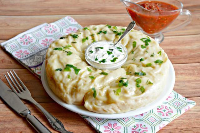 Ханум с картошкой можно подать как к семейному ужину, так и на праздничный стол. Если не добавлять в тесто яйцо, то данное блюдо можно смело отнести к постным или вегетарианским блюдам. Соусы придадут ему особый вкус, отлично подойдет сметанный, чесночный или томатный с зеленью.