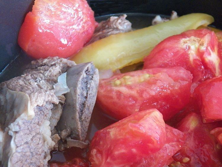 Нарезаем болгарский перец соломкой, к нему подрезаем острый перчик и все добавляем в бульон. Помидоры, нарезанные дольками, следуют туда же. Доводим все до кипения. Пока наш бульон закипает, очищаем картофель, разрезаем на четыре части и добавляем в кастрюлю. Смотрим, когда картофель сварится, под конец варки рубим зелень и добавляем в наше блюдо. Если нужно, досолите и поперчите, это дело вкуса.