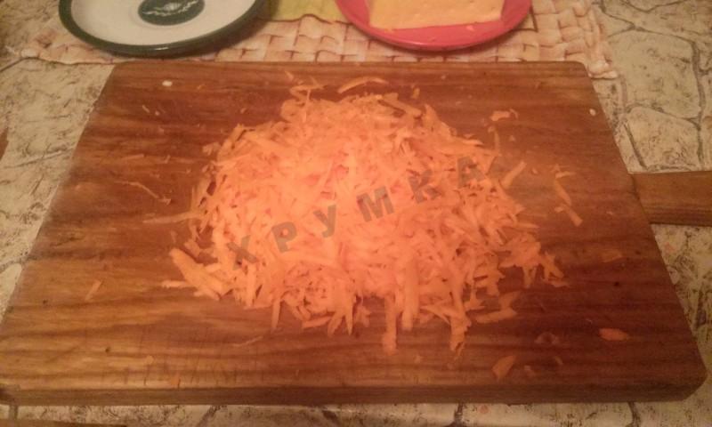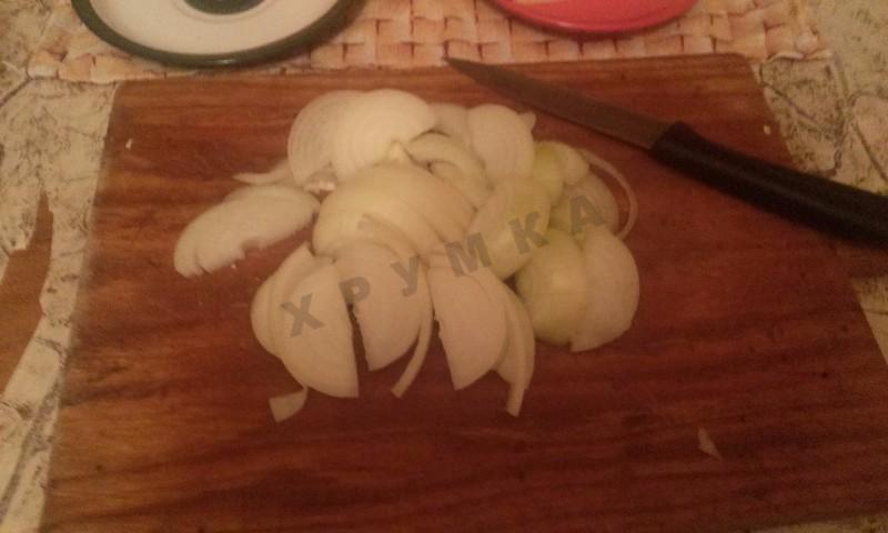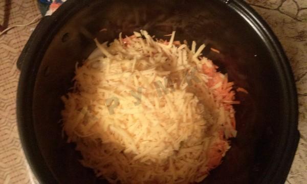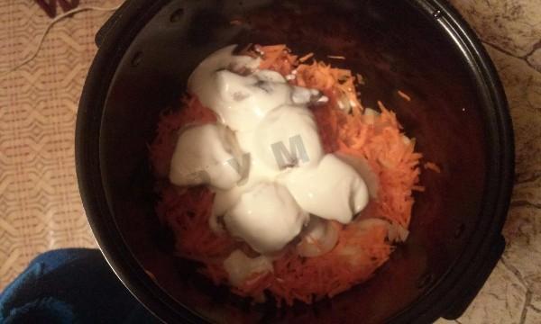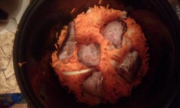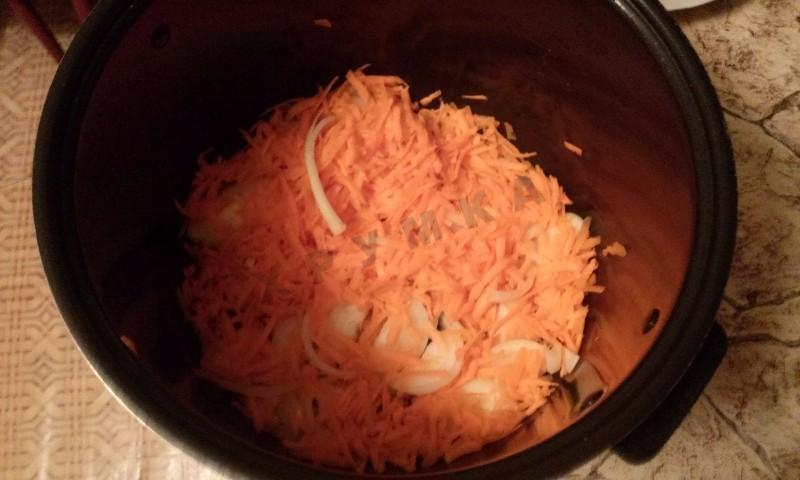 Выкладываем на дно мультиварки,смазаной подсолнечным маслом лук с морковью, создаем так называемую подушку.