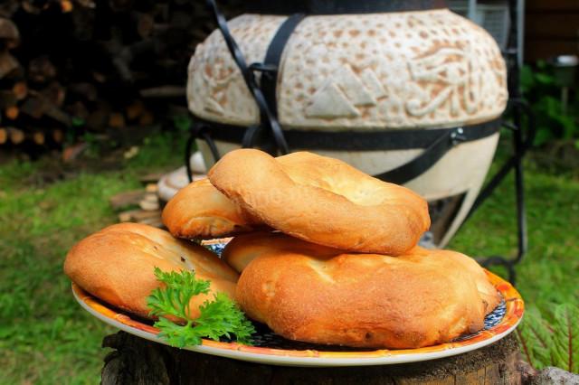 Дно каждой лепёшки смажьте подсоленной холодной водой. Отправьте лепёшки на стенки тандыра. Будьте предельно осторожны, не обожгитесь и используйте специальные жароустойчивые варежки. Закройте снизу поддувало и накройте печь сверху крышкой.