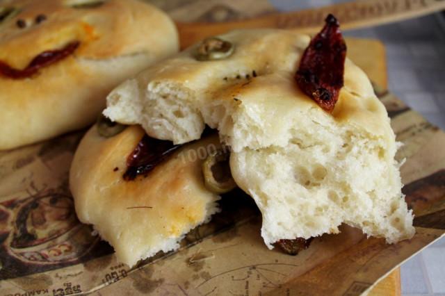 Очень-очень вкусное тесто получается! Пробуй! Хлеб фокачча по этому рецепту получается очень мягким, ароматным, пряным. Подавать его можно к первым блюдам, особенно он хорош с супами-пюре, еще очень вкусно есть просто с молоком, особенно пока он теплый (хоть это и не полезно). Фокаччу можно готовить одной большой лепешкой, размер которой по форме противня, а можно вылепить маленькие лепешечки, из оливок и томатов выложить смешные мордочки - ребятишкам очень понравится!