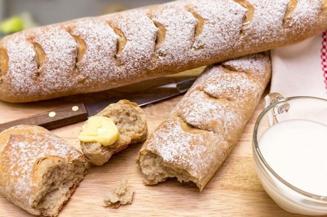 2. Накрываем емкость с тестом пищевой пленкой и оставляем в теплом месте на час. Противень выстилаем пергаментом и слегка посыпаем мукой. Тесто делим на две равные части, формируем из каждой длинный батон, размещаем на противне. Оставляем заготовки в теплом месте на полчаса, прикрыв их полотенцем.