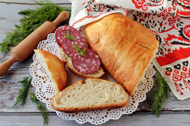 Поставьте форму с хлебом в холодную духовку и установите температуру около 180 градусов. Выпекайте батон в течение примерно 50-60 минут до готовности. Точное время и температуру запекания определяйте по своей духовке. Выньте готовый батон из духовки и сразу удалите рукав для запекания. Накройте хлеб полотенцем и оставьте до полного остывания.