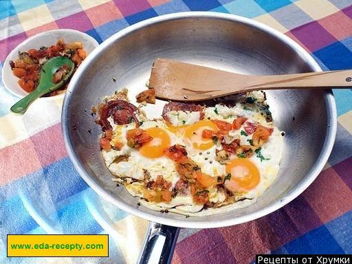 Теперь добавляем на сковородку яйца и наш, ранее приготовленный, соус. И теперь осталось жарить, пока яйца не будут готовы.