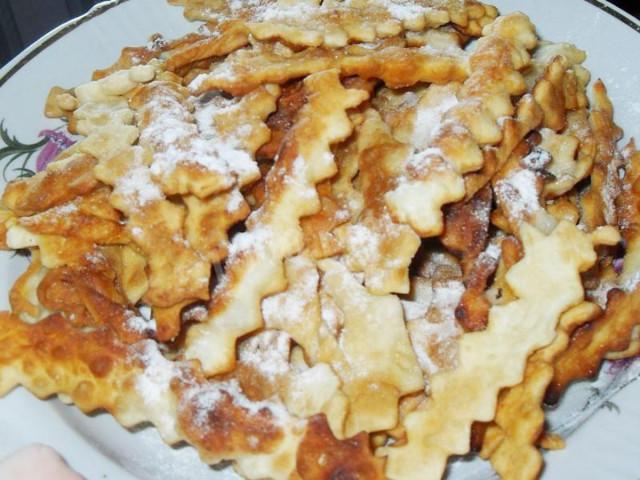 Наливаем в сковороду масло, хорошо его нагреваем и обжариваем в нем получившиеся заготовки хвороста до золотистого цвета сначала с одной стороны.