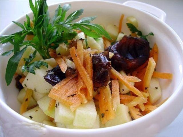 Сначала приготовим заправку. Для этого смешаем мед, свежевыжатый сок лимона и мяту. По мне так можно туда же добавить оливковое масло (тогда и каротин лучше усвоится). Смешиваем морковь (крупно потертую на терке), яблоки (режем кубиками, а при желании заранее очищаем от кожуры), мелко рубленые финики (не забываем вытащить косточку) и петрушку. Заливаем заправкой. Для получения совсем правильного салата надо дать ему настояться 15 минут. Еда готова, можно приступать к трапезе.
