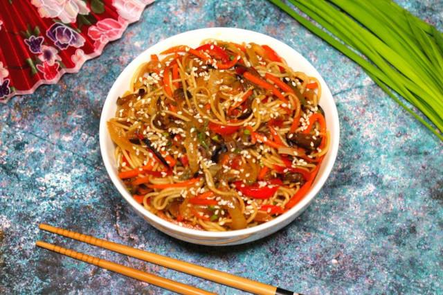 Красочность овощей и бесподобный аромат в одном блюде! Данное блюдо выглядит очень привлекательно, его аромат так и манит, а красочность овощей радует глаза, что сразу же разыгрывается аппетит. Такая лапша с овощами и соусами никого не оставит равнодушным!!!