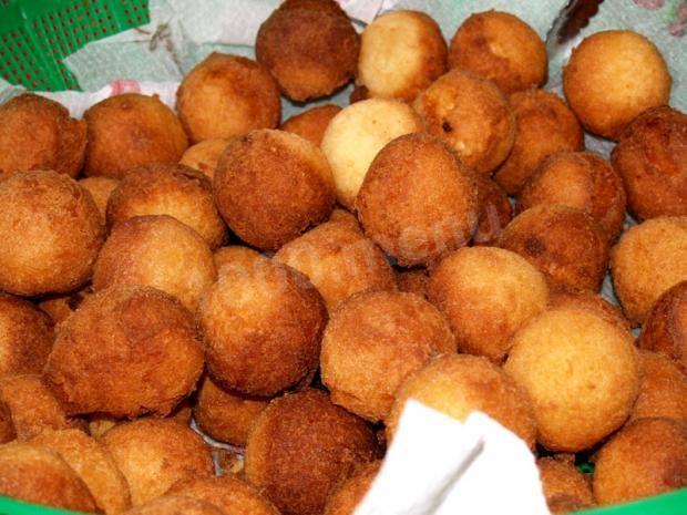 Разогреваем в котелке растительное масло. Для того, чтобы сформировать пончик, мы набираем тесто в руку, зажимаем его пальцами, переворачиваем ладонь и сжимаем кулак. Тесто продавливается через большой и указательный пальцы в форме шара. Жарим пончик в масле несколько минут, постоянно переворачивая его. Если шар стал золотистого цвета и "раскололся" - значит готов.