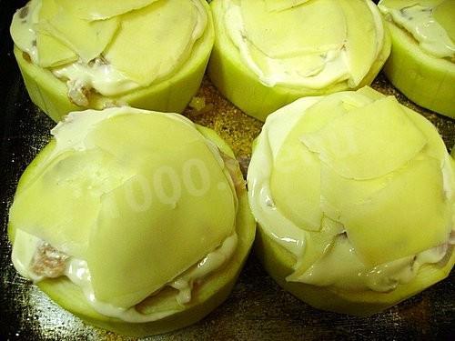 Чтобы их приготовить, нужно взять кабачок. Очистить его от шкурки и порезать на кольца. Из каждого удалить семечки и мякоть. Затем возьмите противень. Смажьте его маслом. Посыпьте панировочными сухарями. Выложите на него кабачки. Потом приготовьте фарш. Для этого порежьте рыбу на маленькие кусочки, репчатый лук. Сварите рис и перемешайте его с рыбой. Фарш поперчите и посолите по вкусу. Перемешайте тщательно все ингредиенты. Заполните кабачки фаршем. Потом смажьте все майонезом. Сверху накройте фарш сыром, который порежьте тонкими пластинами. Можно потереть его на терке, но так он может рассыпаться. Выпекать кабачки нужно при температуре в 180 градусов в духовке около 45 минут. Приятного вам аппетита!