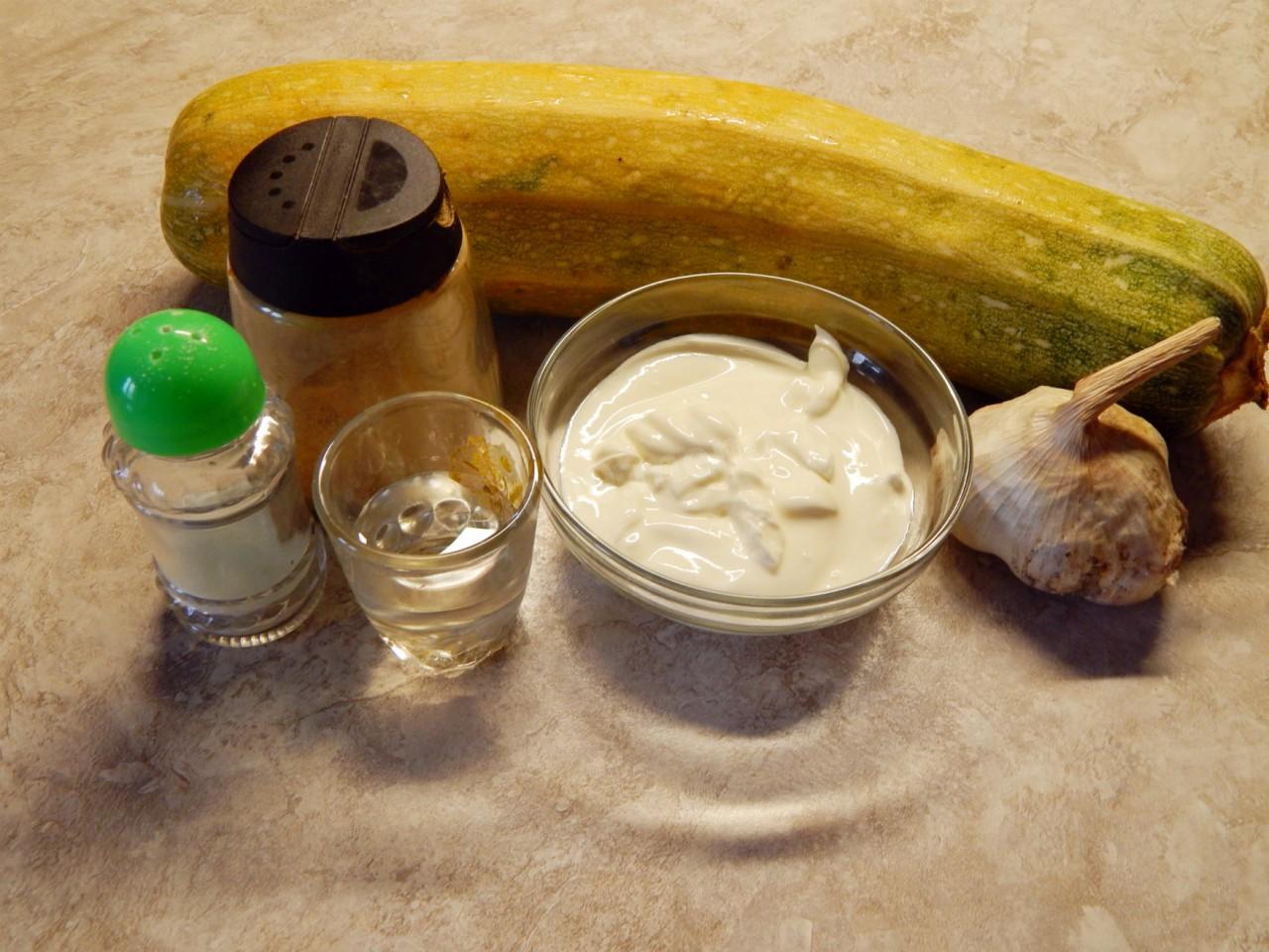 Приготовим ингредиенты. Поскольку кабачки имеют нейтральный вкус, просто с соусом из йогурта они будут казаться пресноватыми. Поэтому для того, чтобы блюдо стало особенно вкусно и ароматным добавим к нему пару зубков чеснока. С таким вкусом блюдо будет оценено даже мужчинами, которые скептически относятся к овощным блюдам, особенно приготовленным из кабачков.