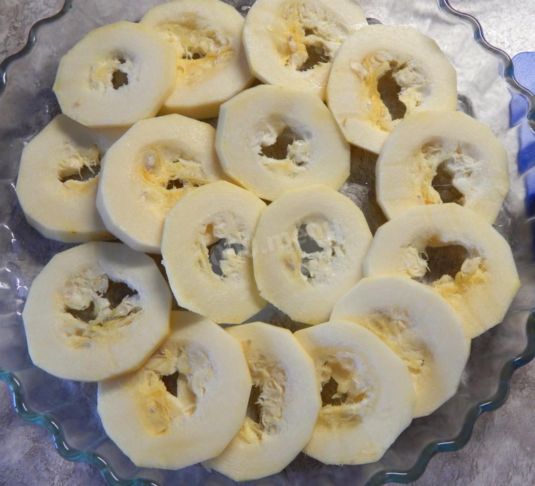 Кабачок лучше брать молодой, небольшого размера, в котором нет сердцевины с семенами. Такой кабачок более нежный и вкусный. Кабачок моем, снимаем кожицу овощечисткой. Если кабачок зрелый, то удаляем сердцевину с семенами. Нарезаем кабачок кружочками толщиной не более одного сантиметра.