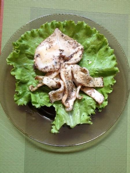 Тушки кальмара необходимо почистить, вынуть внутренности и промыть в холодной воде. Далее необходимо сделать надрезы, чтобы получились, будто бы лучики солнышка. Посыпаем щедро тушки кальмара смесью молотых перцев и солью. Используем любимые специи для морепродуктов и приготовления рыбы. А также добавьте зерна кунжута, если их не было в приправах, все перемешиваем.
