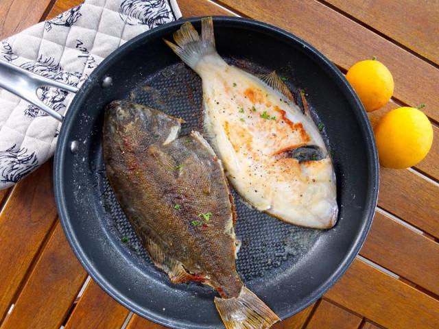 Подготавливаем большую сковороду с толстым антипригарным дном. Поставим ее на средний огонь, нальем растительное масло и нагреем. Выкладываем тушки камбалы на сковороду и обжариваем рыбу в течение 5-6 минут с каждой стороны до аппетитной золотистой корочки.