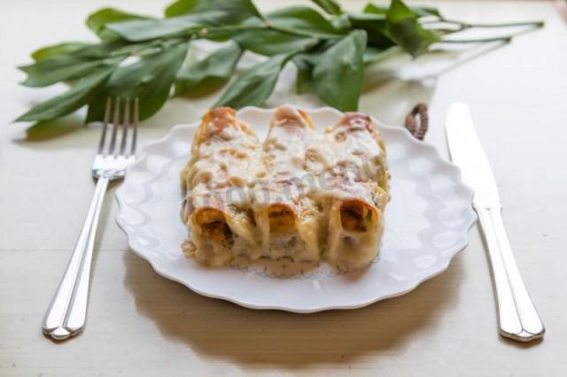 5. Заполним каннеллони нашей начинкой. Выложим в форму для запекания, предварительно смазанную маслом. Польем соусом, накроем фольгой или крышкой и уберем в духовку на 40 минут, при температуре 180 градусов. За 10 минут до готовности снимем крышку (или фольгу) с формы и дадим блюду подрумяниться.