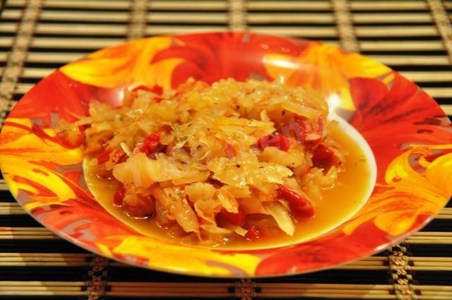 Замечательное овощное блюдо на каждый день! Легкое, вкусное! Готовь! Вот еще один кулинарный рецепт постной или вегетарианской еды - капуста с болгарским перцем. Но мы можем использовать такой горячий салат как гарнир к мясным блюдам. А можем и во время приготовления добавить в него кусочки вареной курицы или колбасу. Тут все зависит только от вашей фантазии. Этот рецепт можно назвать основой.