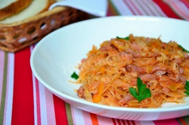 Добавляем капусту в сковороду и жарим-тушим на среднем огне до готовности, если сока от помидор не достаточно, то во время тушения нужно добавить немного воды. Добавляем в капусту соль и перец по вкусу, по желанию добавляем лавровый лист.