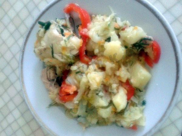 Чистим,режем картофель,добавляем к капусте. Солим-по вкусу. Тушим до полуготовности картофеля.