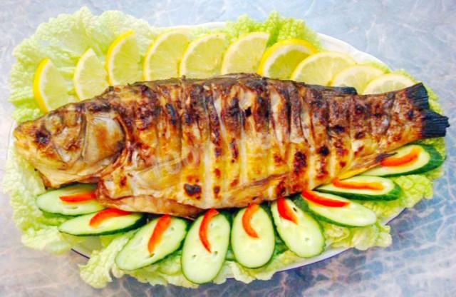 Мы часто выезжаем с семьей на природу, где первым делом встает вопрос о том, что бы такого вкусненького и быстренького приготовить, чтобы все были сыты и довольны, потому что на свежем воздухе аппетит всегда есть у всех. Обычно мы жарим шашлыки, варим полевую кашу, готовим плов, запекаем картошку на углях и другие овощи на барбекю. Не менее часто мы собираемся у нас во дворе и устраиваем посиделки с друзьями, во время которых также готовим что-то на открытом огне. В этот раз к нам приехал кум, которого мы давно не видели. Такую долгожданную встречу мы решили отметить во дворе, где у нас всегда стоит мангал. Будучи заядлым рыбаком, кум перед приездом к нам поймал вот такую прекрасную рыбку и предложил ее приготовить, как говорится, не отходя от кассы. Сама я еще ни разу так не делала, но кум поделился своим опытом и рассказал, как приготовить рыбу на костре на решетке на углях - он в этом настоящий спец. Помогали все, но жарил кум. Вышла просто потрясающая рыбка, которая улетела со стола первым делом. Хорошо еще, что я успела ее сфотографировать! К запеченным карпам я подавала много овощей - какие-то из них мы ели в сыром виде, а какие-то запекали. А еще хорошо подошел жареный на огне хлеб, который я и все мои родные просто обожаем. В общем, наш уик-энд удался на славу. Благодаря ему, мы добавили в свою копилку рецептов на природе запеченную таким способом рыбку!