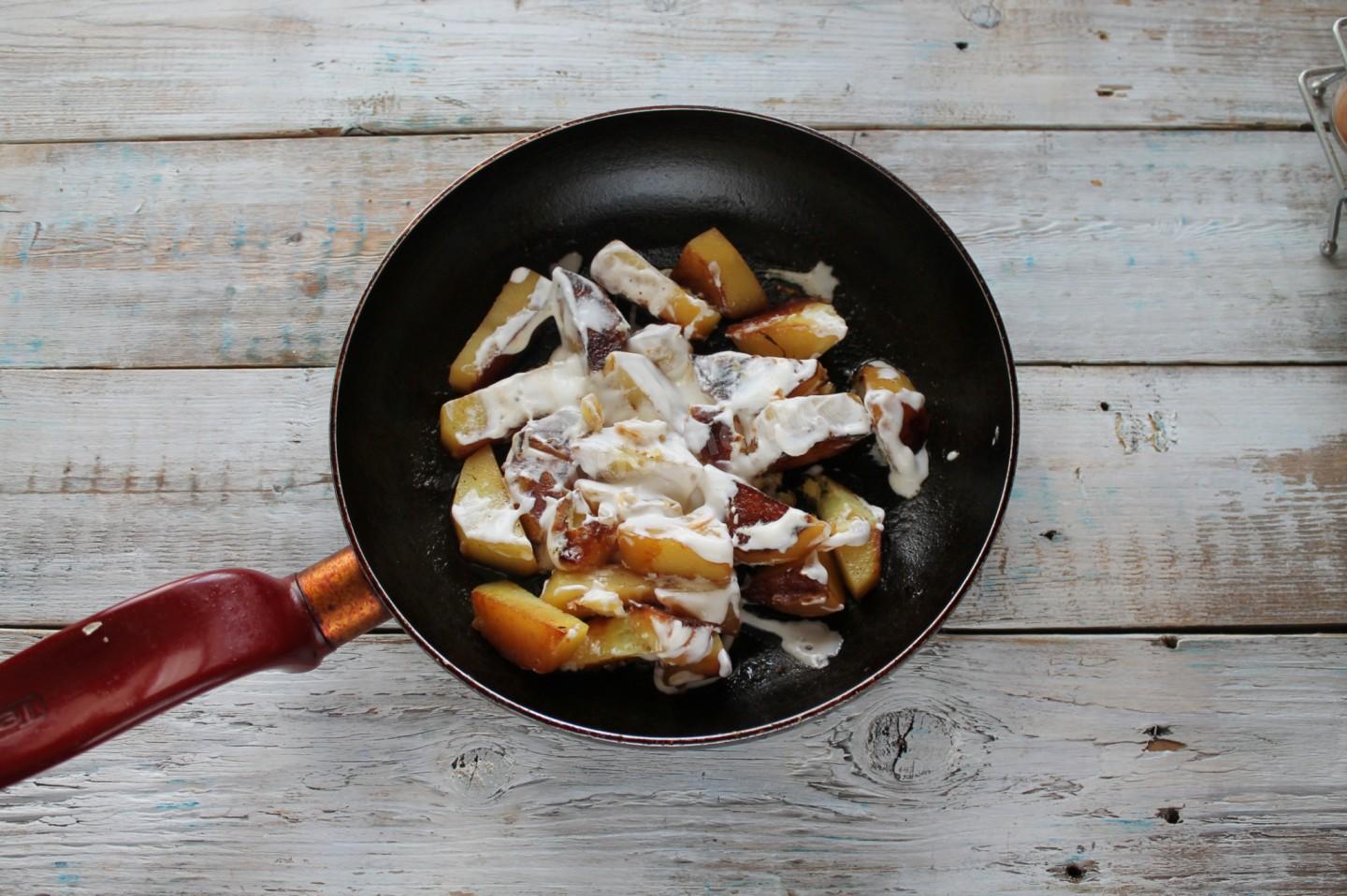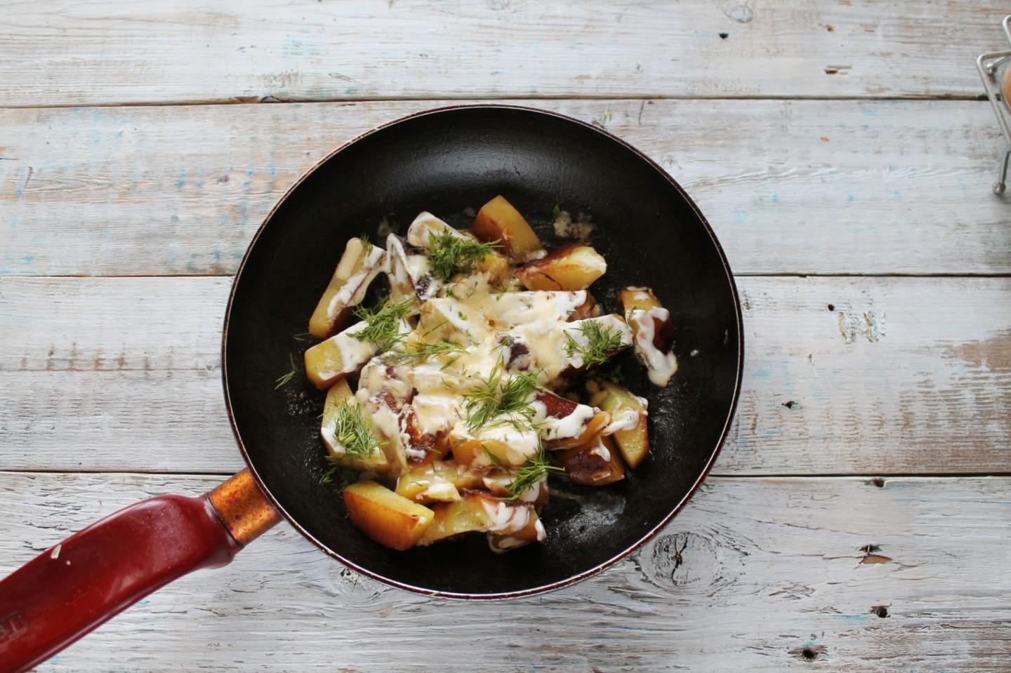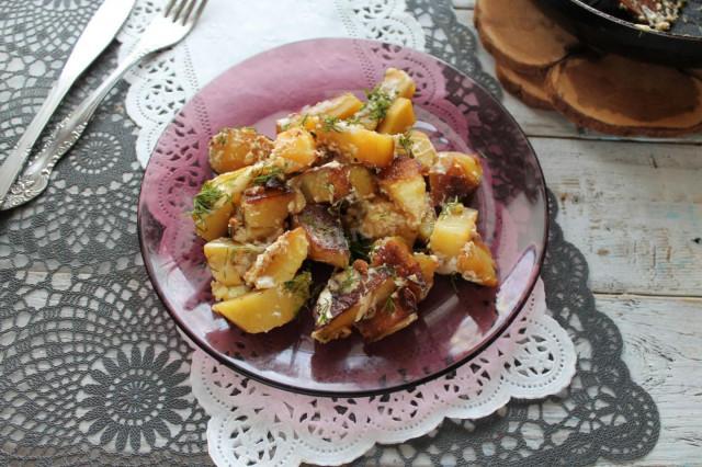Подавайте картошку, тушенную со сметаной в сковороде, присыпав зеленью укропа или лука.