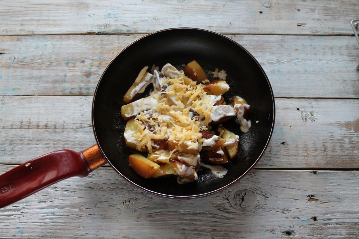 Присыпьте горячую картошку натертым на крупной терке твердым сыром.