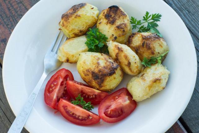 Отваренный практически до готовности картофель необходимо почистить. До полной готовности будем доводить его на открытом огне! Очищенный картофель, если необходимо разрежьте на половинки, небольшой так и оставьте. Картофель посолите, добавьте черный молотый перец и другие пряности на свой вкус. Добавьте немного растительного масла. Руками или ложкой аккуратно перемешайте, чтобы каждой картофелинке досталось и масло, и соль, и перец.