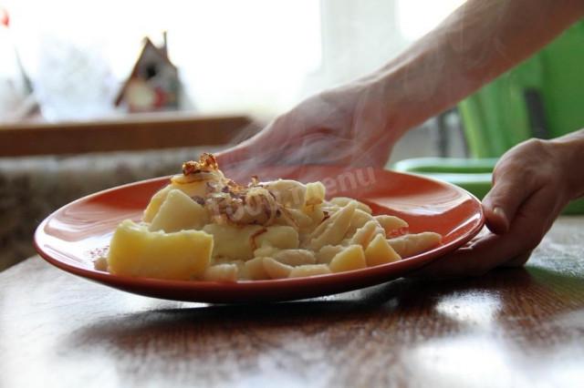 Картофель почистить, крупно разрезать и поставить вариться. Пока вариться картофель необходимо приготовить тесто на клецки, Для этого в муку разбить яйцо и постепенно вмешивая добавлять воду. Замешивать тесто до однородного состояния. Подождать пока картошка развариться и, предварительно разделив тесто на колбаски, добавлять, отрезая его в кастрюлю с картошкой. После того как все галушки поднимутся на поверхность варить в течении 4-5 минут. Готовый картофель и галушки опрокинуть на дуршлаг. Добавить обжаренный на сливочном или топленом масле лук в готовое блюдо! Отдельно к блюду можно подать сметану.
