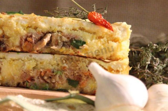 Смажьте чашу мультиварки маслом и выложите две трети картофельной массы в чашу. Ровно распределите ее по дну чаши.