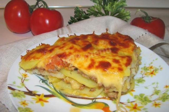 4. Форму для выпечки выстилаем пергаментом, выкладываем картофель в один слой, затем выкладываем часть фарша, разравниваем, посыпаем сыром.
