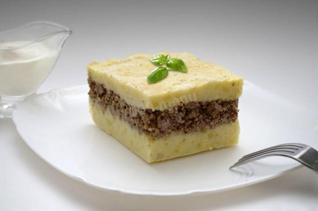 6. Форму для запекания смазываем сливочным маслом, посыпаем панировочными сухарями всю смазанную поверхность. Выкладываем в форму половину картофельного пюре, приминаем, чтобы слой получился равномерным. Затем на картофельный слой кладем фарш, разравниваем, фарш немного вдавливаем в нижний слой. Завершающим слоем выкладываем оставшееся картофельное пюре, также разравниваем поверхность будущей запеканки, немного приминаем, делая запеканку более плотной.