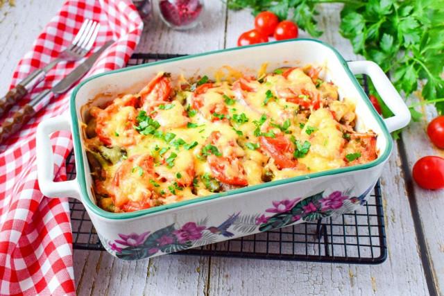 Оставшийся помидор нарежьте ломтиками и разложите по поверхности запеканки. Сверху посыпьте сыром, натертым на терке. Поставьте форму в духовку, предварительно разогретую до 180 градусов, на 30 минут. Все ингредиенты почти готовы, а картофель на самом дне успеет пропечься за это время.