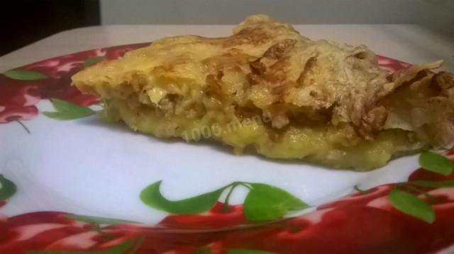 на этом этапе мы выкладываем фарш поверх картофельного пюре- примерно до краев слоеного теста