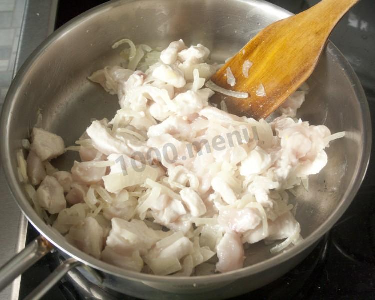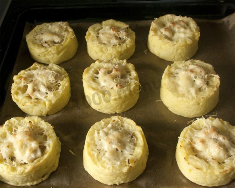 Затем в картофельные гнезда выложить начинку из куриного филе и лука (выкладывать плотно).