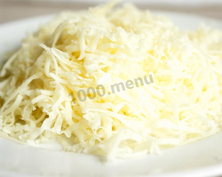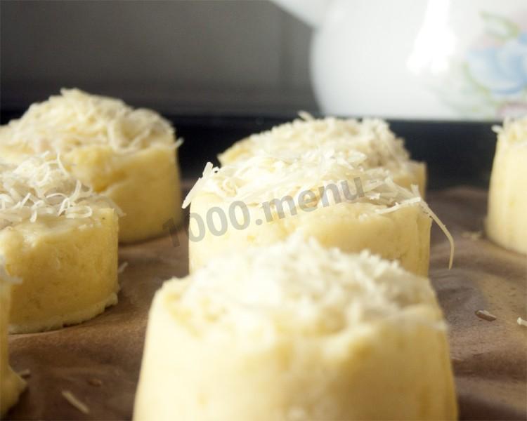 Сверху на начинку выложить натертый сыр. Вкуснее, когда сыра много. Далее поставить противень с картофельными гнездами в разогретую духовку. Запекать 20-25 минут при температуре 180°С