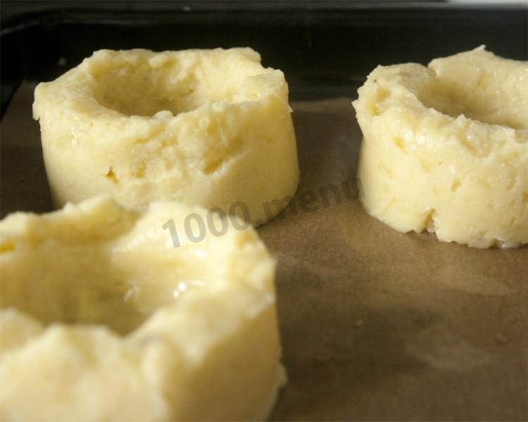 Застелить противень пергаментом, а пергамент смазать маслом. Сформировать из картофеля "гнезда". Их можно формировать руками, либо использовать каике-то формы или выдавить пюре из кондитерского мешка. В итоге должно быть дно и стенки.