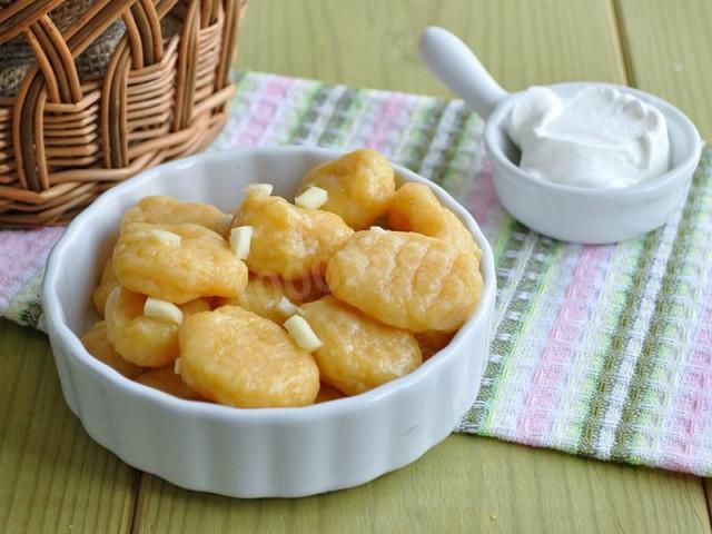 8. Порубите мелко чеснок, смешайте его с растопленным сливочным маслом. Полейте готовые ньокки этой смесью.