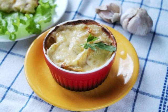 Залейте его подготовленным соусом из сливок. Поставьте в духовку на 180 градусов на 45-50 минут.